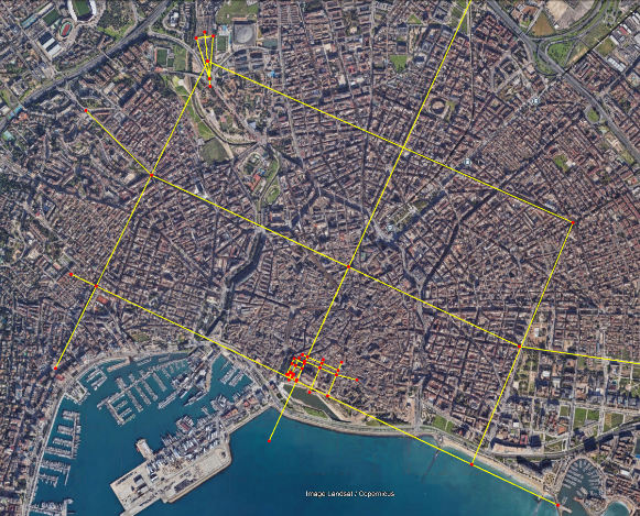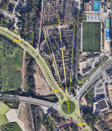 Traçat hipotètic de l’Ager tardoromà fossilitzat en els carrers mes llargs de Palma; Balmes, Arxiduc, Azaña i fra Juniper Serra.