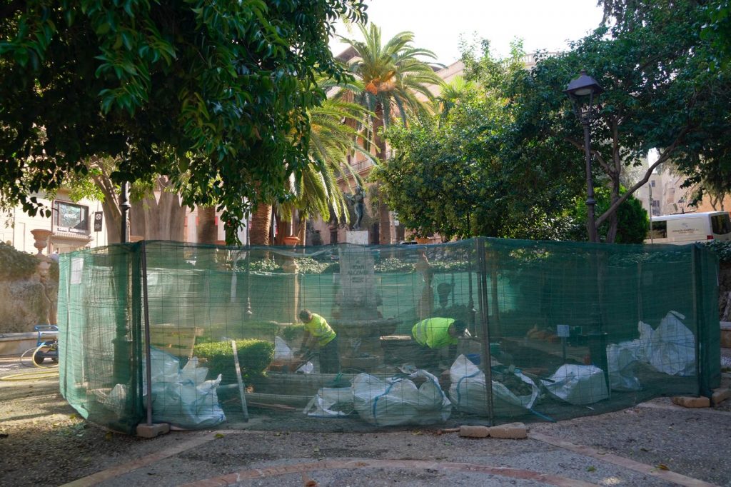 Palma, 16 de octubre de 2025. El área de Infraestructures, Accessibilitat i Polígons Industrials del Ajuntament de Palma ha iniciado esta semana los trabajos de restauración de la fuente ubicada en los jardines de la plaça de la Reina, uno de los espacios más emblemáticos del centro histórico de la ciudad.