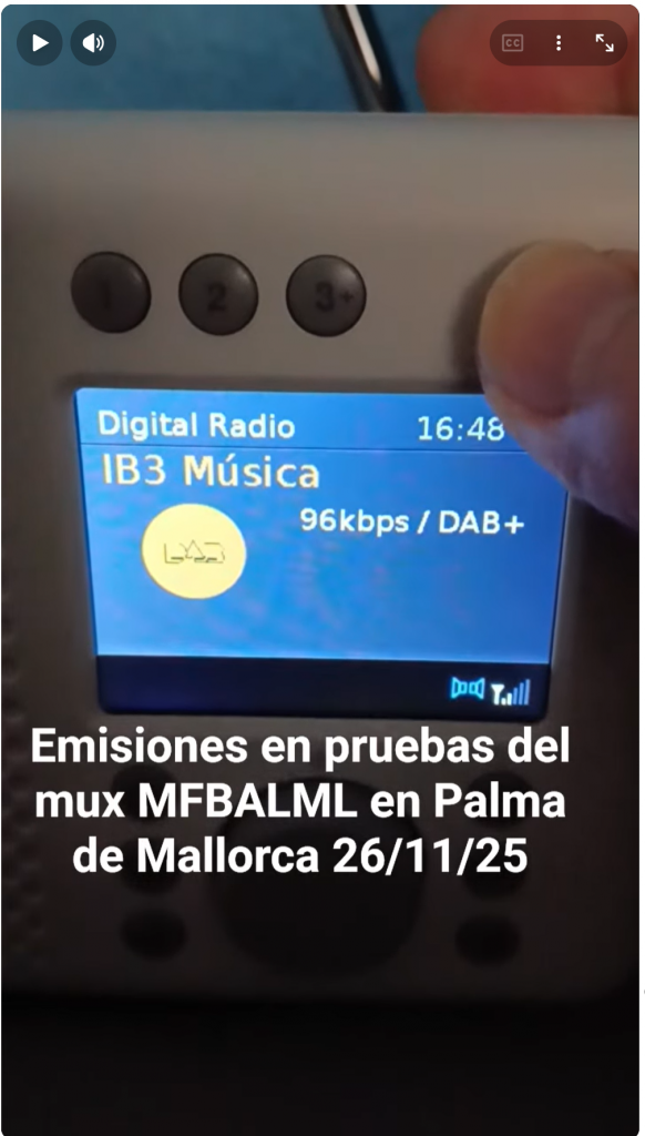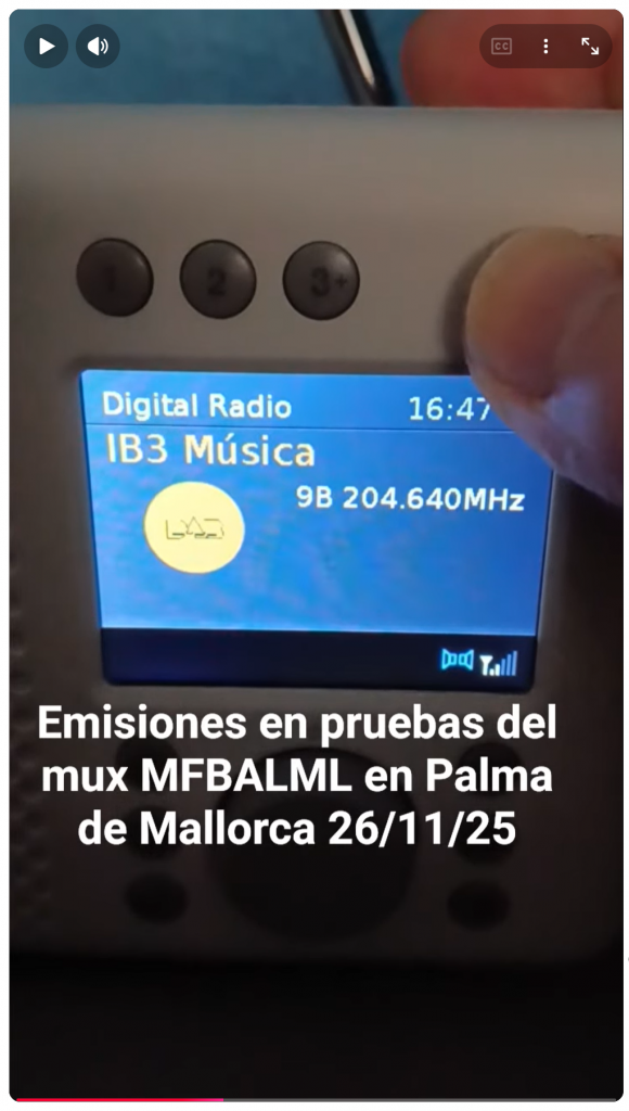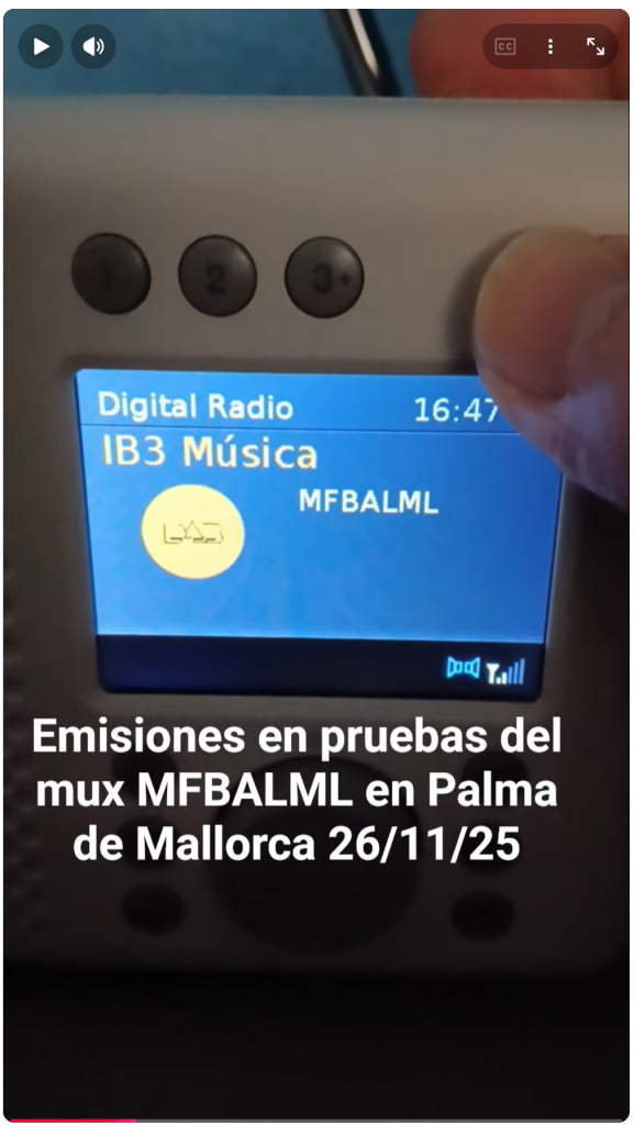 De momento hemos podido constatar la realización de algunas emisiones en pruebas. Se trata de pruebas realizadas en horas que parecen elegidas al azar, y son de una duración de muy pocos minutos. Hemos podido captar en diversas ocasiones algunas de ellas. De momento salen tres estaciones del mux llamado MFBALML. Los nombres de estas tres estaciones son: «IB3 2 DAB+», «IB3 Mallorca DAB», y por último «IB3 Música». Todas ellas las hemos podido captar con una tasa de transmisión de 96Kps. No hemos visto que tuvieran logo o diaporama asociado, pero la brevedad de las pruebas no nos permite saber si carecerán de imágenes asociadas, o no es el momento para implantar dichas imágenes. Nos ha llegado con fuerza a interiores de viviendas, y pongo tres «pantallazos» de uno de los vídeos que hemos podido enlazar en Youtube.