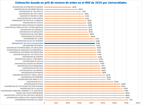 La UIB presenta un p50 de 4.325, mejor que la media de las universidades públicas (4.358) y muy por encima de la media de las privadas (5.446). De hecho, seis de las diez universidades con peores resultados son privadas, una tendencia que subraya la solidez del sistema público. La mejor universidad del país registra un p50 de 2.300 y la peor, 7.175.