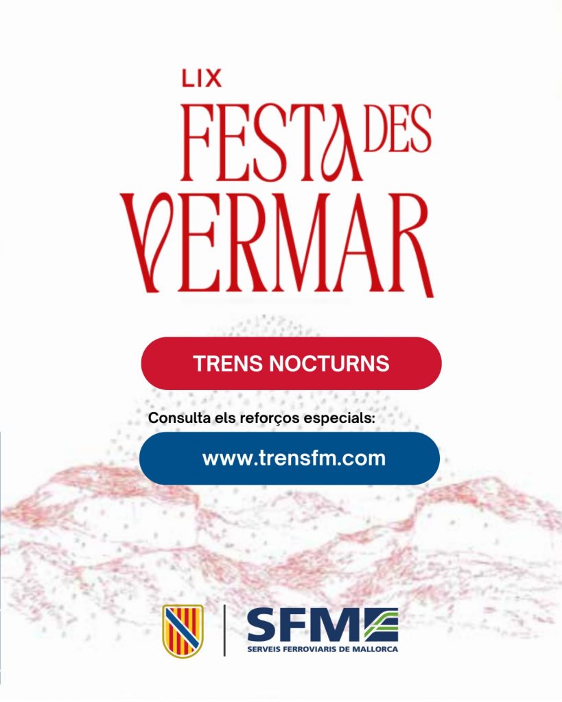 Palma, 25 de septiembre de 2025. Serveis Ferroviaris de Mallorca (SFM) ha anunciado la puesta en marcha de servicios especiales de tren con motivo de las fiestas de Es Vermar de Binissalem, con el objetivo de garantizar un desplazamiento cómodo y seguro para todos los asistentes. La programación incluye refuerzos durante la tarde, trenes nocturnos la madrugada del viernes al sábado, y un servicio adicional el domingo a primera hora.